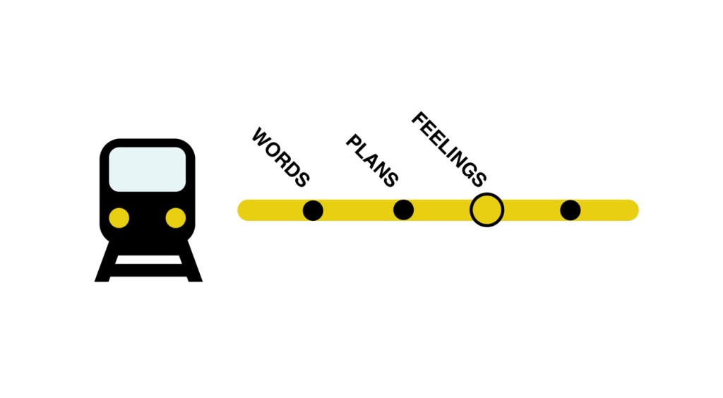 Okay so let’s get going. Whistle blows, the train roars into motion. We’re chugging through the countryside and at the first stop, the station name reads “Words“. Here, we find our identity by just pronouncing and publicising who we are. Let’s say you think you’re generous. Well here we say “Everyone, I am a generous person.” And who hasn’t been here? All you need to do is convince your friends or even strangers of who you are and that’s enough. A few influencers try to convince you to get off the train. But you think of that wise old man. You look to the back of the carriage and he opens one eye, peers out at the station name, and then settles back to sleep. This isn’t his station. The whistle blows and the train returns to a steady motion.